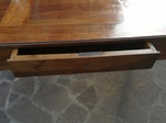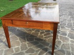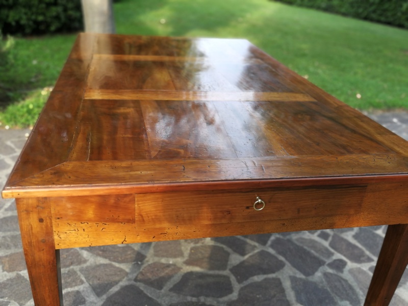 Elegante ed importante (anche dimensionalmente; 198x118x80 cm) originale tavolo epoca Direttorio (fine XVIII sec.) in noce massello costruito in ambito lombardo retto da gambe tronco piramidali indicative dello stile, presenta ben 4 cassetti sottopiano. Piano con cornici a chiudere che formano un bellissimo movimento con il gioco delle venature. Il mobile è stato restaurato secondo le regole dell'arte, partendo dal trattamento antitarlo, finendo con la verniciatura a gommalacca stesa a stoppino. Pronto per essere collocato. Gradita la visione senza impegno. Ritiro diretto presso di noi. Il mobile si trova a Castel Goffredo (Mn)